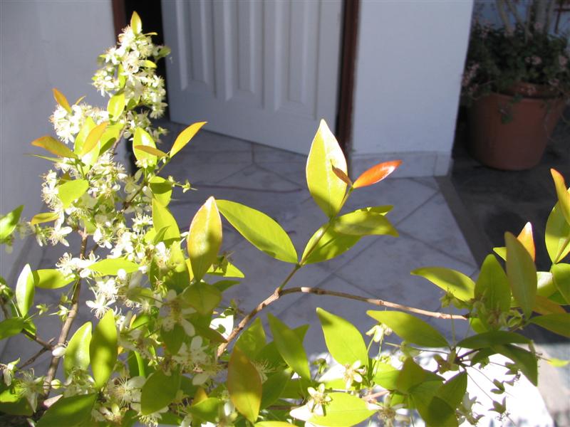 arbusto que se cubre de flores blancas que parecen capullos de nieve y sus hojas parecen transparente, en primavera entre verde y morado. Y en verano da frutos rojos como guindas