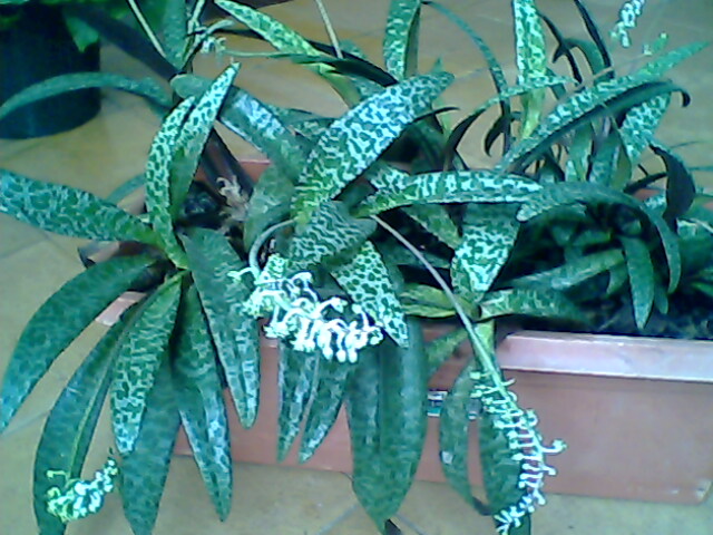 bulbos por encima del suelo, de los que se elevan hojas estrechas y carnosas. El haz gris verdoso, el enves purpura brillante. Flores verdes con estabres vilea